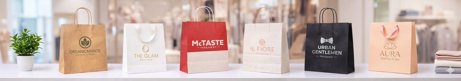 Seleziona tra diverse tipologie di buste personalizzate per negozi, in vari formati, colori e materiali (kraft, bianco o neutro, con manici rigidi o morbidi).